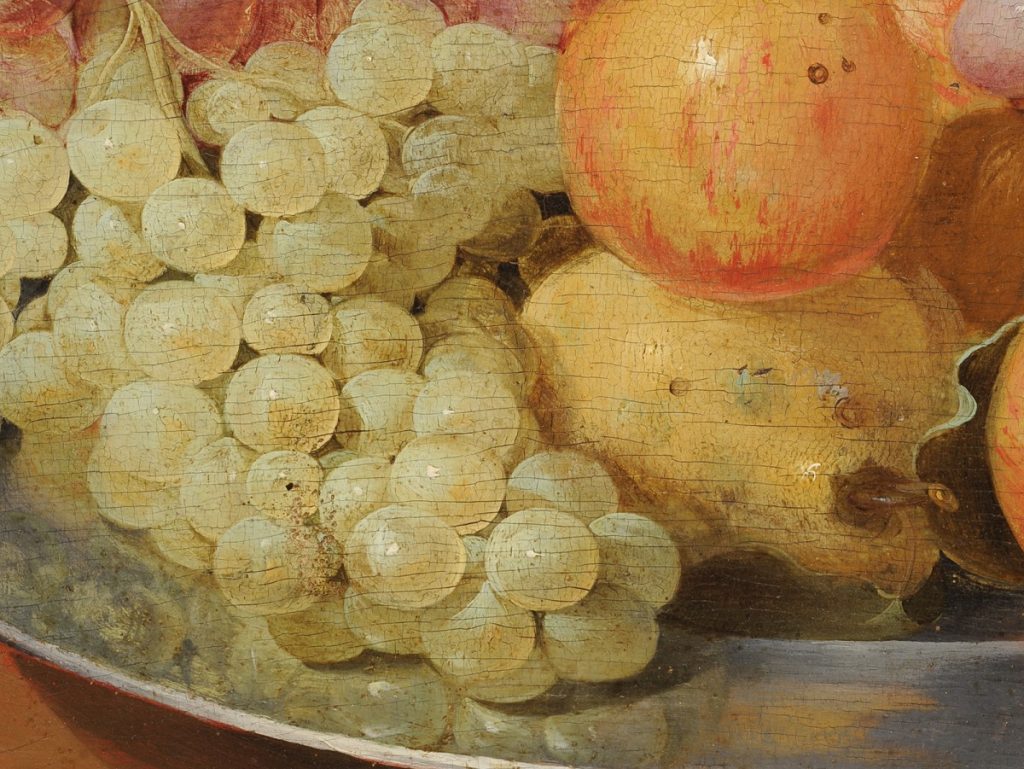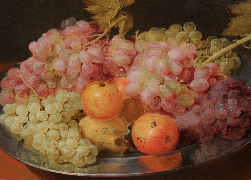 La vue est particulièrement plongeante sur cette coupe de raisins et pommes disposée sur le plan incliné d’une table.