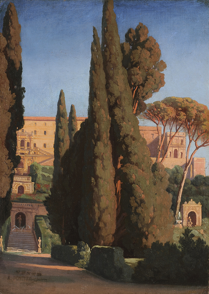 La vue, une des plus iconiques pour la représentation du site, mais ici plus « ouverte » car légèrement décalée vers la droite, permet de placer les cyprès au centre de la composition et de visualiser l’arc situé à l’extrémité de la terrasse du Vialone. Elle est, notamment, très proche d’une huile sur panneau (41 x 30 cm) de William Collins (1788-1847) exécutée vers 1837 et conservée au Victoria & Albert Museum, d’une huile (46 x 32 cm) de 1841 d’Edward Lear (1812-1888), d’une aquarelle d’Achille Benouville (1815-1891) datée 1861 ainsi que d’une huile (40 x 32 cm) du même Benouville datée 1868.