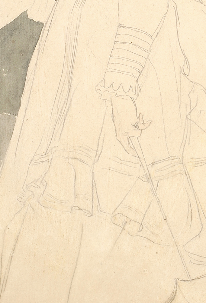 C’est en août 1879 que Tissot réalise cette feuille dans le parc de Saint Germain en Laye, devant une pièce d’eau que l’on ne distingue que par la forme grise en arc de cercle à l’arrière-plan. Certainement au même moment, il réalise une autre feuille de même format avec le même cadrage représentant Lady Mary Craven, dont l’aquarelle est bien plus aboutie que notre portrait, mais dont la finesse a disparu en dissipant les traits sous la couleur.